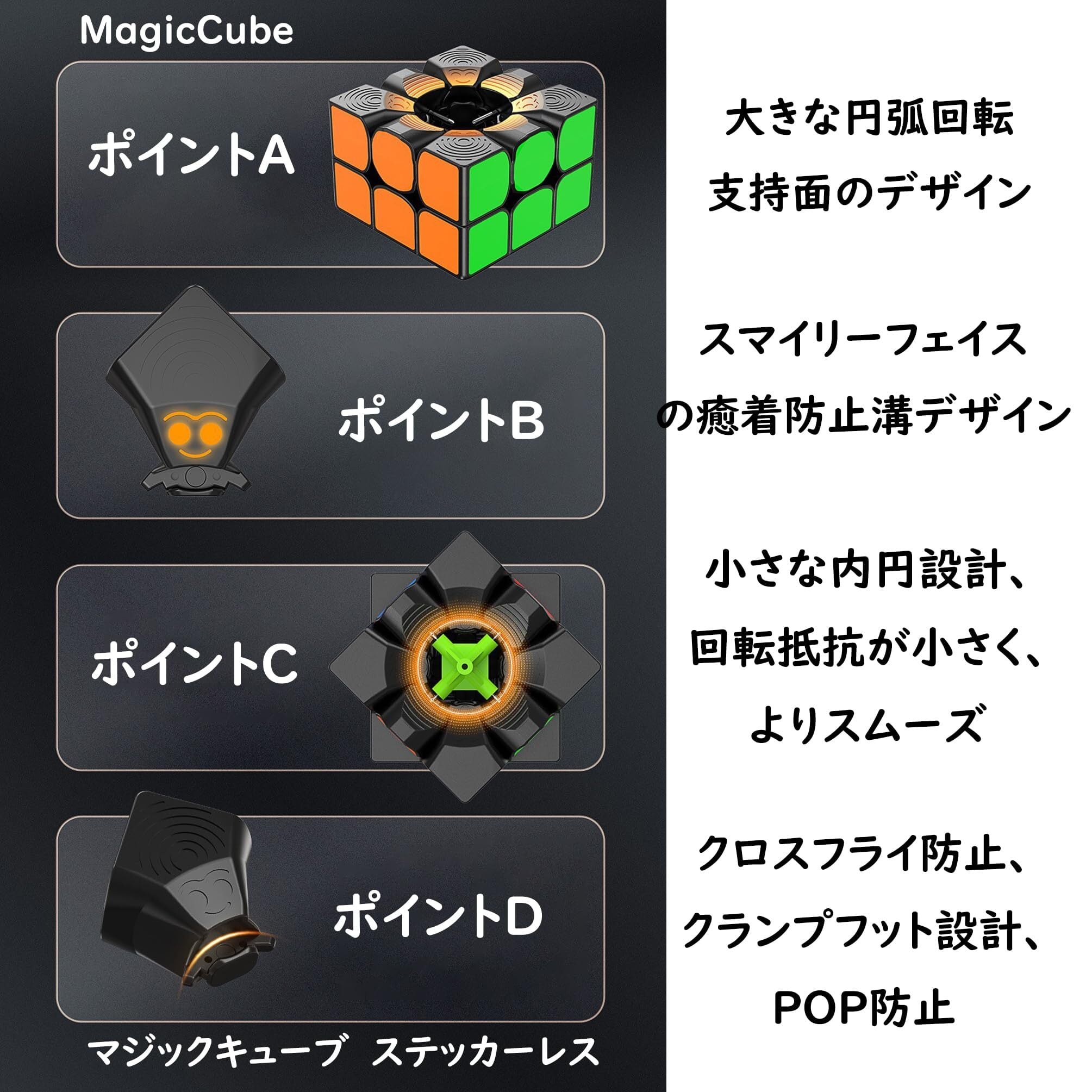 ステッカーレスデザイン: 当社のマジックキューブは2024年の新しいデザインで、従来のステッカー工法を完全に廃止しました。このユニークなステッカーレスデザインは、ステッカーが剥がれる問題を効果的に解消し、キューブの色合いをより鮮やかにします。